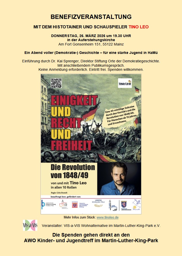 VIS-a-VIS ist es gelungen, den Histotainer Tino Leo für eine Benefizveranstaltung zu gewinnen. Der Eintritt ist frei, aber Spenden sehr willkommen, denn wir möchten dem AWO-Kinder- und Jugendtreff unter die Arme greifen. Kommt also zahlreich am Donnerstag, 26. 3., um 19:30 Uhr, in die Auferstehungskirche. Der Flyer kann hier heruntergeladen werden.